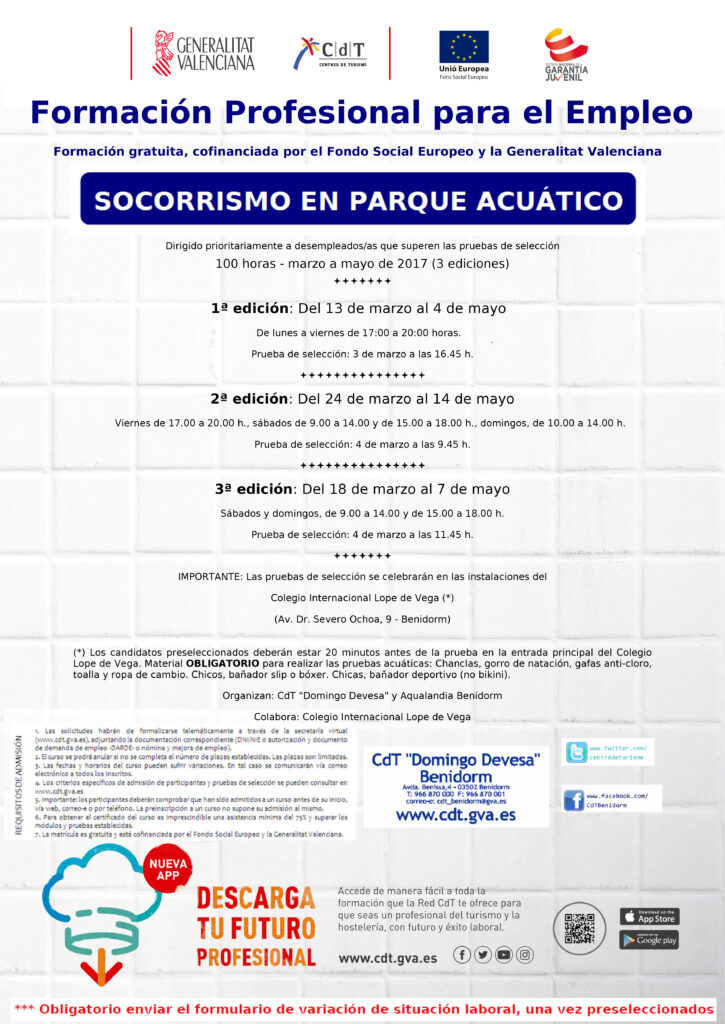 Como todos los años, organizamos junto con el Centro de formación y Turismo Domingo Devesa de Benidorm, los cursos de socorrismo necesarios para poder formar parte del gran equipo de socorristas de uno de los parques acuáticos más importantes de Europa.